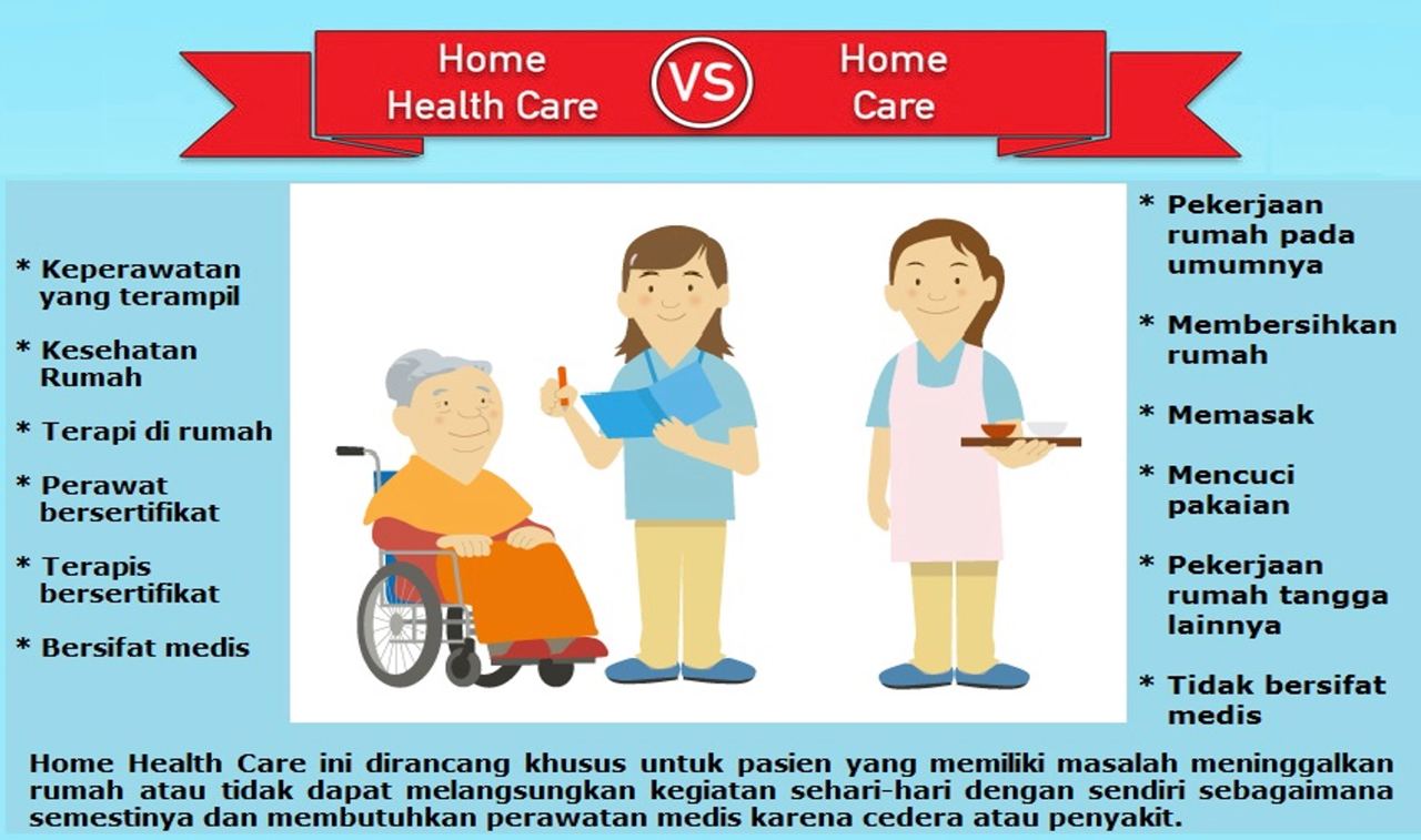 Sangat penting untuk memahami perbedaan antara perawatan kesehatan di rumah dan layanan perawatan di rumah, mungkin terdengar sedikit sama tetapi sama sekali tidak sama. Berikut adalah perbedaannya - perawatan kesehatan di rumah termasuk beberapa layanan perawatan kesehatan di rumah, yang bersifat medis atau berhubungan dengan perawatan kesehatan. Sedangkan layanan perawatan di rumah termasuk pekerjaan rumah pada umumnya seperti membersihkan rumah, memasak, mencuci pakaian, dan pekerjaan rumah tangga lainnya. Tetapi perawatan kesehatan di rumah biasanya melibatkan membantu seseorang untuk pulih dari penyakit atau cedera.
